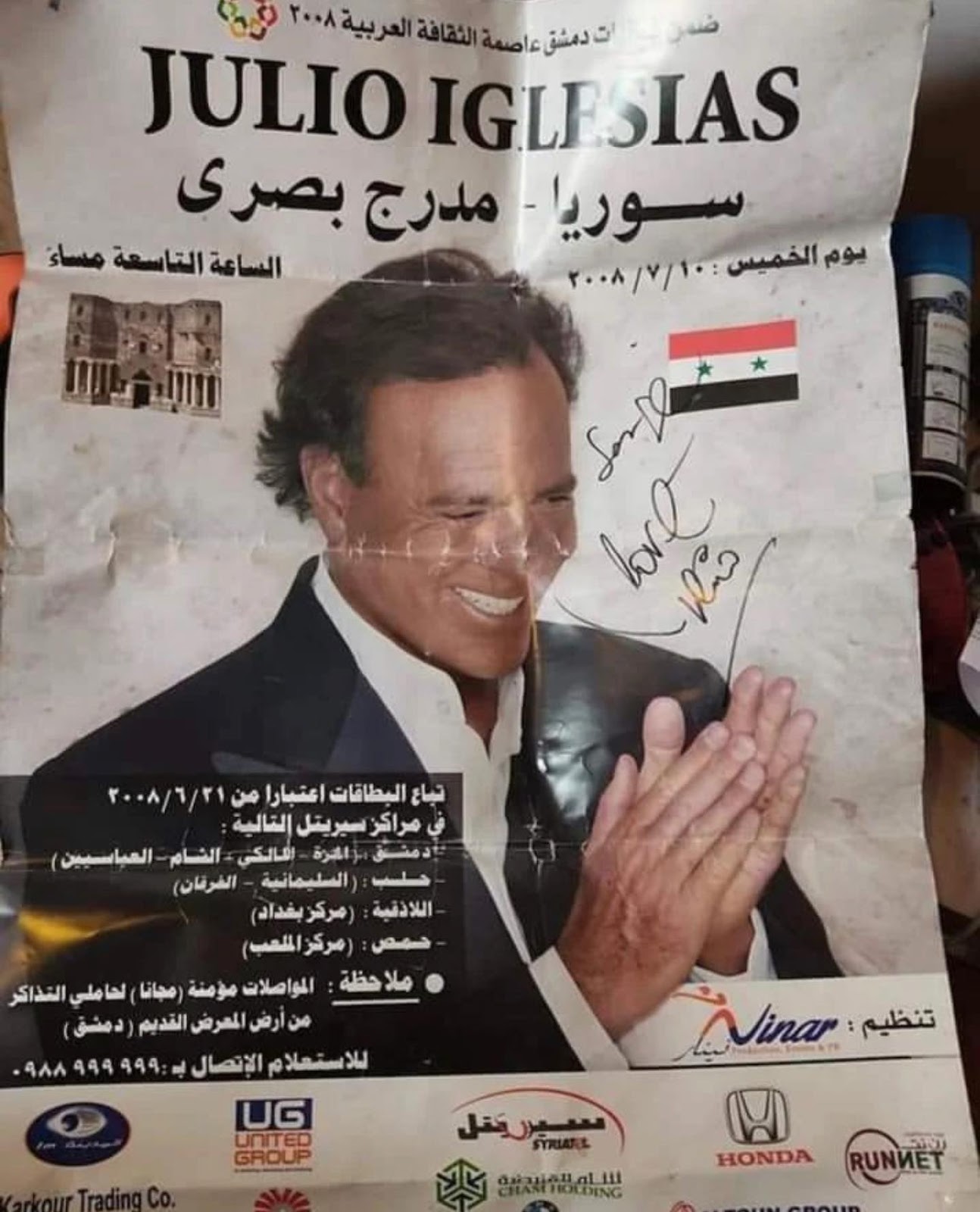 بالـ2008، صار حدث مميز بسوريا! لما المغني الإسباني المشهور خوليو إجلسياس زار الشام لأول مرة وغنى بحفل بمسرح بصرى الأثري جنوب دمشق. هالزيارة كانت جزء من احتفالية دمشق عاصمة للثقافة العربية، وخّلت الجمهور السوري يعيش تجربة موسيقية استنوها كتير.