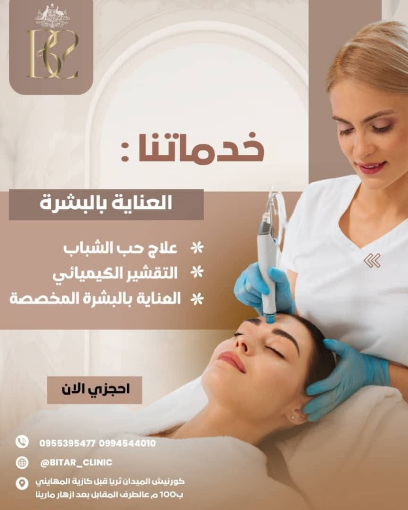 البيطار مركز مختص بالبشرة بكل تفاصيلها بإدارة الدكتورة رزان البيطار وبيقدم خدمات: تقشير، ميزو، بلازما، ديرمابن، بوتوكس، فيلر، عناية بالبشرة المخصصة… مع خدمات شد الوجه والجسم، علاج ترهلات، وتجميل أنف. كمان فيه عيادة سمنة وعلاج لمشاكل الشعر.
