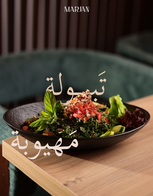Salads are light and fresh, like crab salad or Marjan tabbouleh, which go perfectly with seafood. Pair it with a refreshing drink, like red lemon juice, for a light finish.