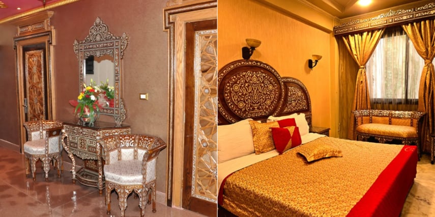 From the moment you enter, it feels like a traditional Damascene house. Carved wood, old patterns, mosaic ceilings, and marble fountains give the place a warm, authentic feel. Every corner reflects the spirit of old Damascus.
